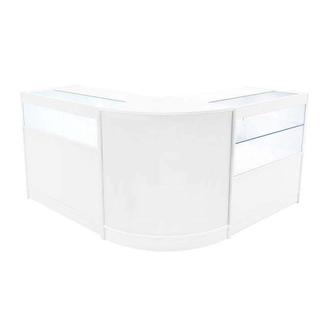 Denna kollektion av vit LED-belysta kassadiskbord kombinerar modern stil och professionell funktionalitet – perfekt för att skapa en elegant och praktisk produktpresentation i alla butiksmiljöer.