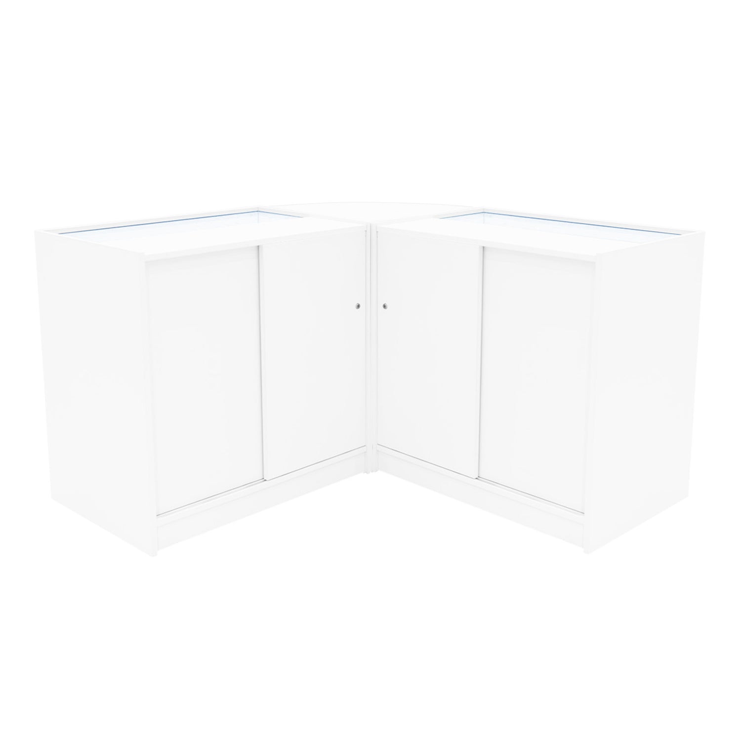 Den eleganta, böjda formen passar perfekt i hörn eller som övergång mellan två raka diskar. Trots det kompakta formatet erbjuder den dold förvaring genom invändiga hyllor (åtkomliga från baksidan när modulen används fristående eller placeras i slutet av en konfiguration) – praktisk förvaring utan att kompromissa med den minimalistiska och stilrena estetiken. En idealisk lösning för att maximera butikens yta samtidigt som den visuella harmonin bibehålls.