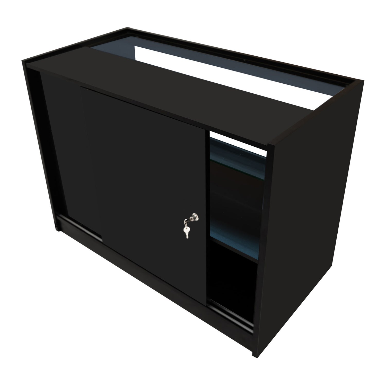Med tre helt slutna exponeringshyllor bakom en front av härdat glas, skapar K900/K1200/K1500 en perfekt balans mellan produktvisning och säker förvaring. De låsbara skjutdörrarna på baksidan ger diskret åtkomst och bidrar till ett rent och professionellt intryck från kundens perspektiv.