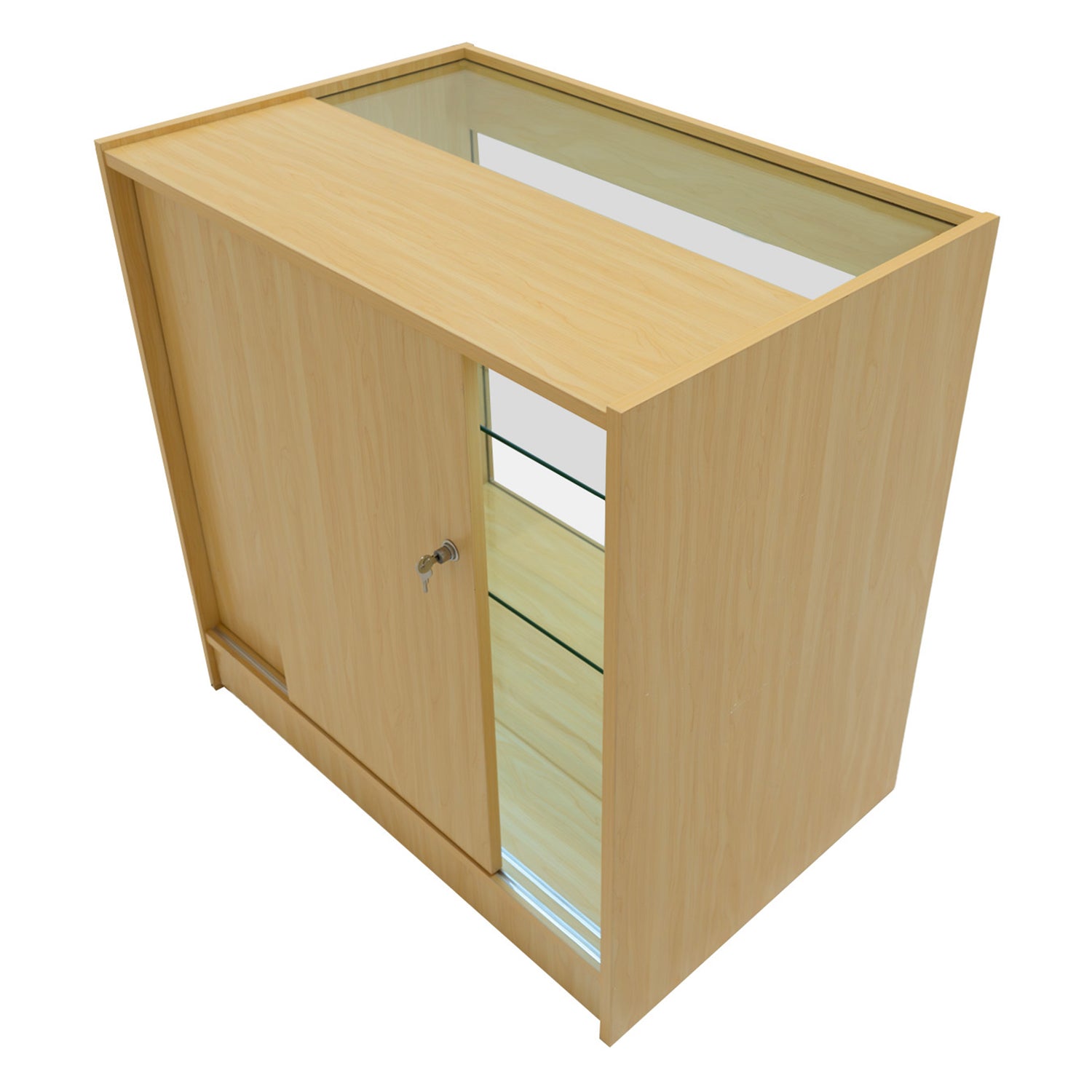 Med en exponeringshylla synlig genom den främre glasrutan och två hyllor dolda från kundens synfält, balanserar dessa diskar perfekt mellan säker förvaring och effektiv presentation. De bakre skjutdörrarna med lås håller lagret säkert samtidigt som disken bibehåller ett rent och professionellt intryck utåt.