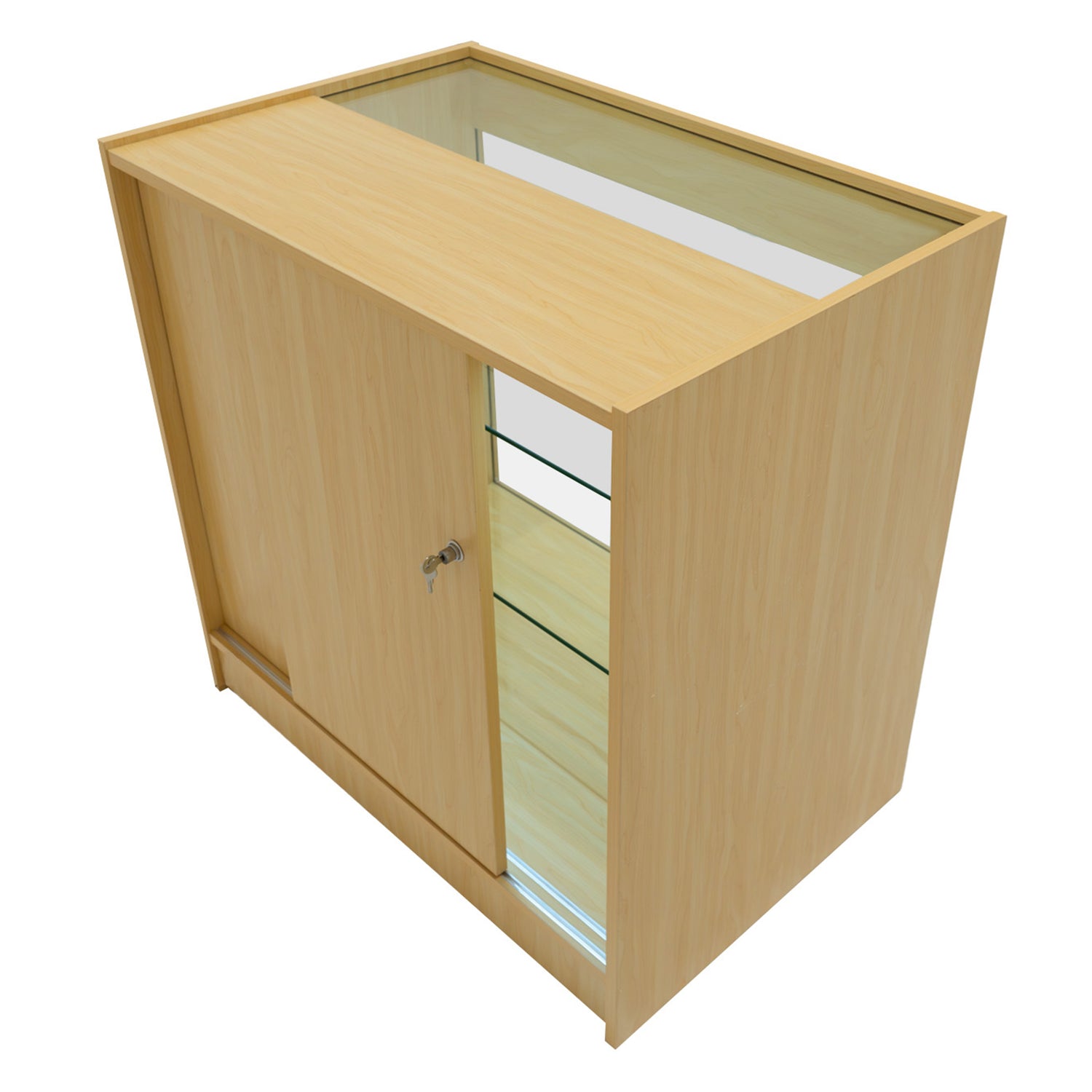 Med en exponeringshylla synlig genom den främre glasrutan och två hyllor dolda från kundens synfält, balanserar dessa diskar perfekt mellan säker förvaring och effektiv presentation. De bakre skjutdörrarna med lås håller lagret säkert samtidigt som disken bibehåller ett rent och professionellt intryck utåt.