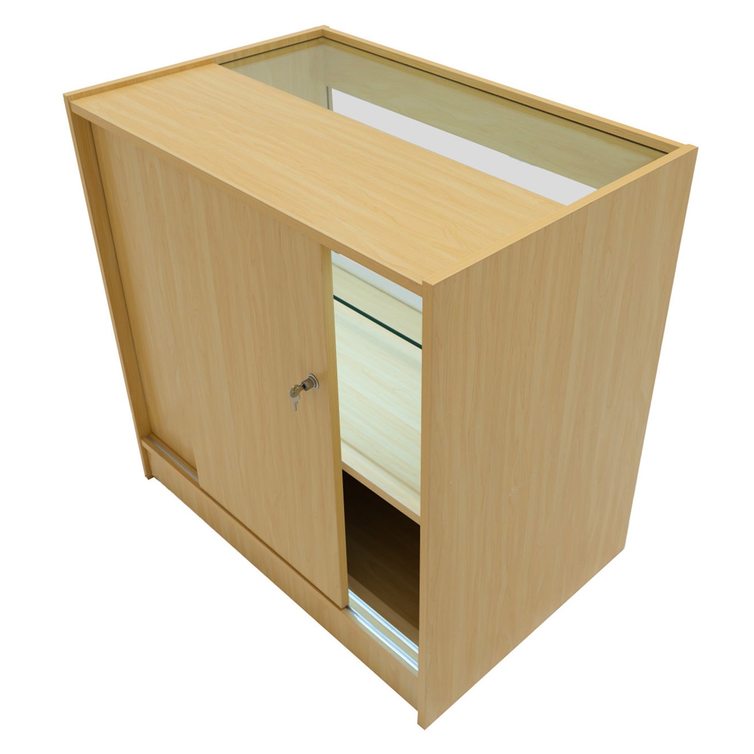 Med en exponeringshylla synlig genom den främre glasrutan och två hyllor dolda från kundens synfält, balanserar dessa diskar perfekt mellan säker förvaring och effektiv presentation. De bakre skjutdörrarna med lås håller lagret säkert samtidigt som disken bibehåller ett rent och professionellt intryck utåt.