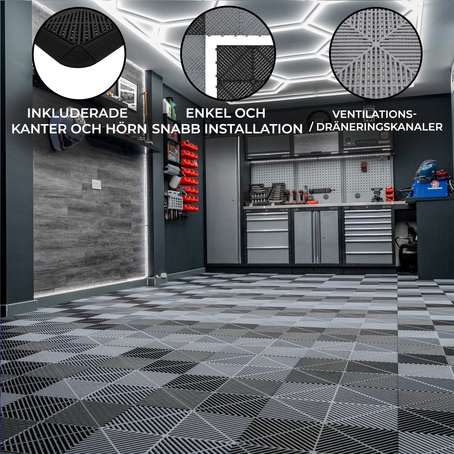 Höj ditt garage eller verkstad med våra garagegolvplattor med ventilationskanaler, designade för att erbjuda oöverträffad hållbarhet, stil och praktisk användning varje dag.