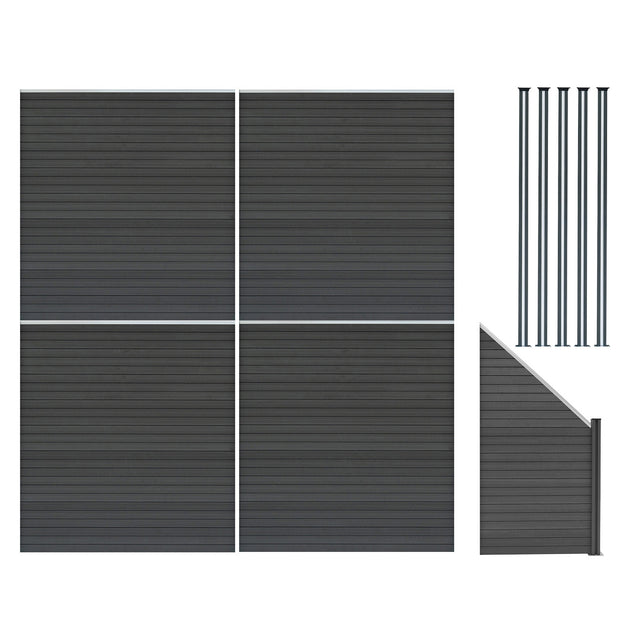 Staket för utomhusbruk i WPC och aluminium – 4x fyrkantig paneler + 1x sned panel + 5 stolpar med LED| Grå