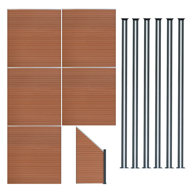 Staket för utomhusbruk i WPC och aluminium – 5x fyrkantig paneler + 1x sned panel + 6 stolpar med LED| Brun
