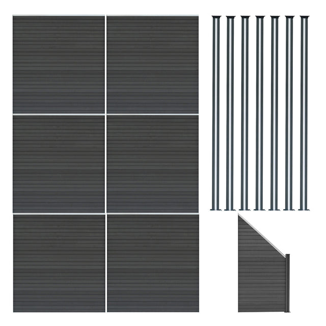 Staket för utomhusbruk i WPC och aluminium – 6x fyrkantig paneler + 1x sned panel + 7 stolpar med LED| Grå